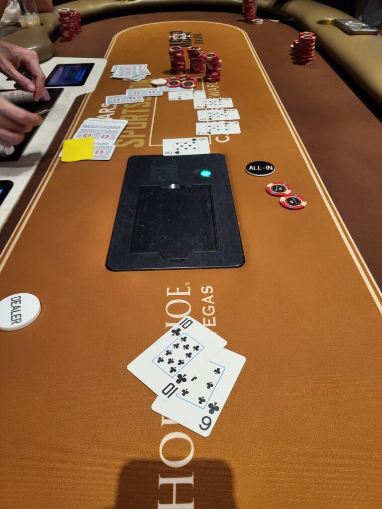Floppet kommer 9♣️8♣️5♣️. Ding ding ding. Fisken i big blind better nu $20. MP kalder og jeg siger nu $55 fra knappen. Begge går nu all-in og de har cirka $100 hver. Potten er lidt over $300. Jeg vender høfligt min hånd, så de kan se, hvad de er oppe imod. Turn er nu 7♣️. Karma, tænker jeg og kan se, at jeg vil vinde high-hand selvfølgelig med min straight-flush. Big blind vender Q♥️Q♦️ mens MP havde en straight med 7♦️6♦️. Lækkert setup og fedt at vinde $100 med high-hand udover den store pot.