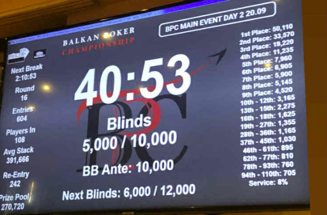Får stakken op i 317.000 på blinds 2.000/5.000/5.000. Da re-entry lukker får vi af vide, at 26 spillere går videre til dag 2. Med 34 spillere tilbage er jeg i 540.000 og det ser rigtig fint ud. Heldigvis undgår jeg de vilde setups og kommer videre til dag 2 med 530.000 chips og er sikret i minimums cash på €705. Tror massagen har gjort underværker alligevel (haha). “So far so good”…