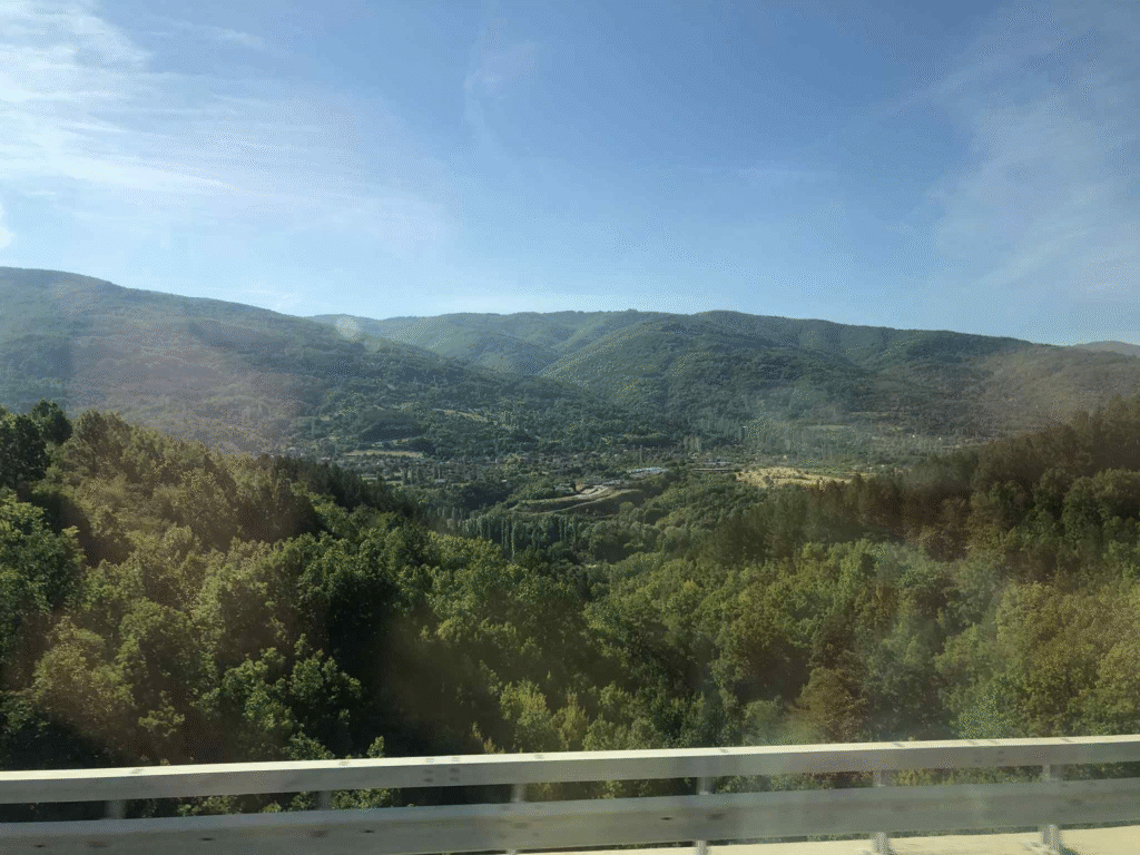Vi kommer med Flix-bussen fra busstationen, som faktisk ikke ligger langt fra hotellet. Alt er nemt – so far – ind i bussen og foran os venter nu 4.5 timers køretur til Skopje. Det er en skøn sprød morgen og det hele ruller bare. Passerer et skønt landskab, men dog også en reminder om, at vi nu er uden for Sofia og de byer, som vi passerer, har huse der i Danmark vil være gedigne håndværkertilbud. Det er et bakket og kuperet grønt landskab, og ud af det blå dukker der også lige et idyllisk placeret atomkraftværk op på nærmeste hold.