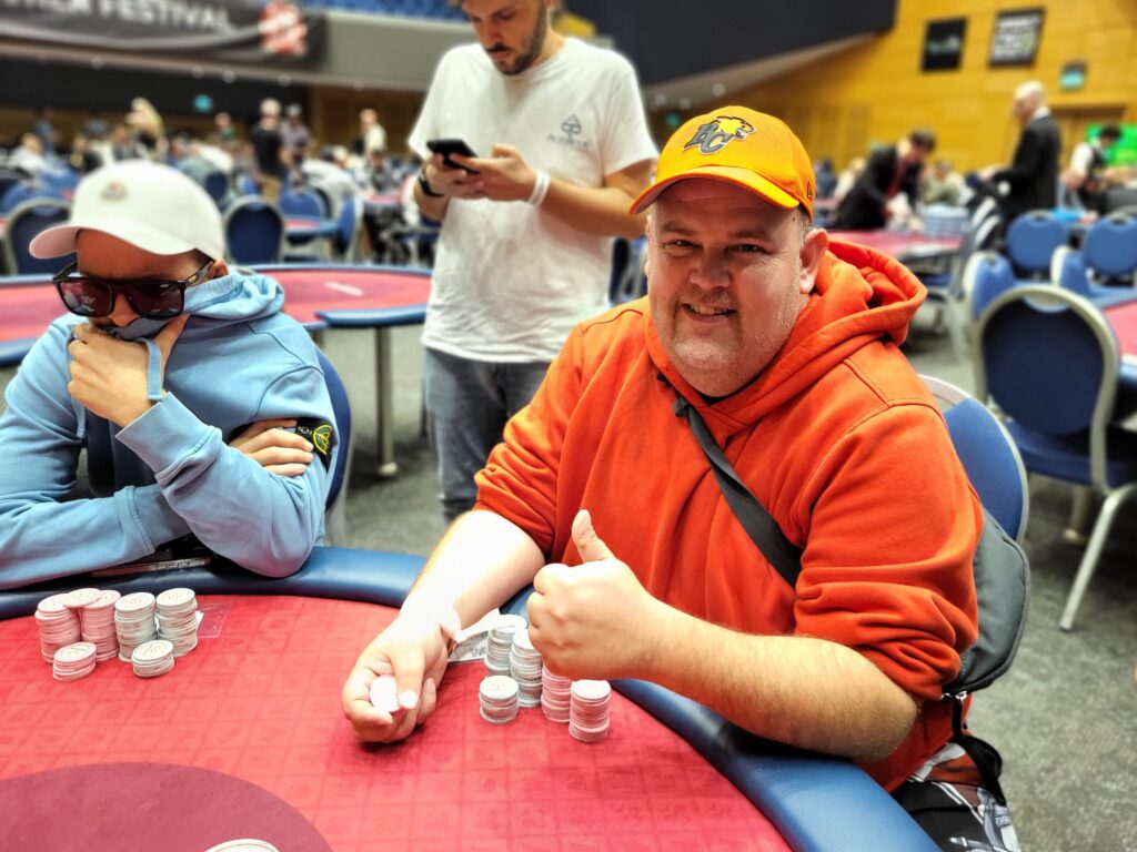 Derfra lykkedes det ikke at få fat igen desværre. Kortene var virkelig heller ikke til det. Alle er all-in hele tiden for blinds er store og når man kigger ned i “lort”, så kan man jo ikke kalde. Ved spisepausen er jeg tilbage i præcis 30.000 og da jeg kommer tilbage fra pausen folder jeg tre hænder og så går min sidemakker all-in fra UTG+1. Jeg skubber