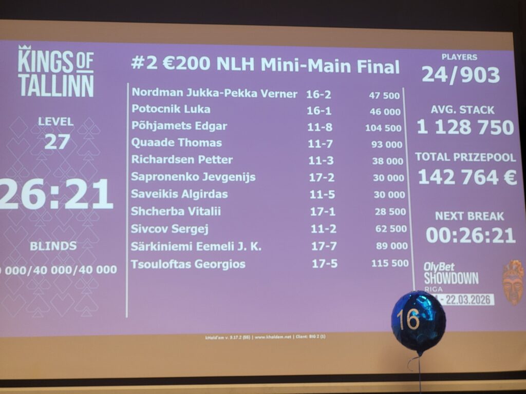 Som afslutning på dagen, så hoppede jeg i €350 King’s of Tallinn Cup, hvor der var et sidste level tilbage. Hvis jeg gik videre til dag 2, så var det først den 8. februar, så det ville passe perfekt ift. min Mini Main Event dag 2, som var i morgen. Jeg nåede dog kun at spille én hånd, hvor jeg fik 7♣️7♥️ ind med 30 big blinds mod A♠️A♥️ på et lavt board.