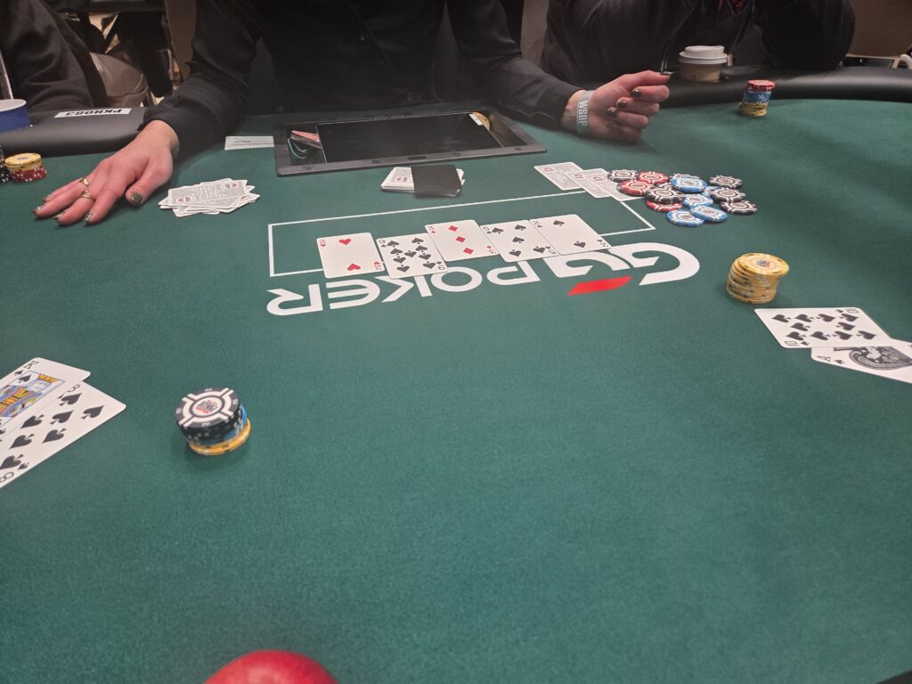 Checket til mig igen. Jeg better nu 1.000 ud i cirka 9.000. Alle folder inden jeg når at tælle til tre. WTF – hvad er chancen for, at ikke en har noget som helst, der kan fortsætte på det board? Nå, men “we’ll take it, I guess”, tænker jeg småfrustreret.