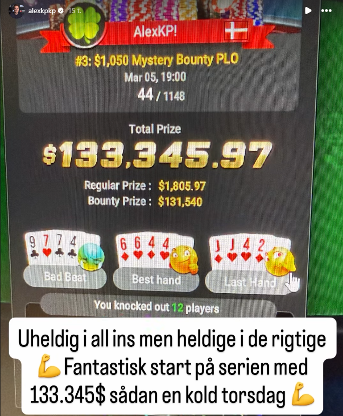 I nat bliver han nr. 44 ud af 1.148 i WSOP-SC: $1.050 Mystery Bounty PLO. Den placering gav $1.806. Men men, IP-adressen er som nævnt varm hos KP og han trækker $131.540 i bounties efter 12 af slagsen. Samlet er præmien på $133.346.