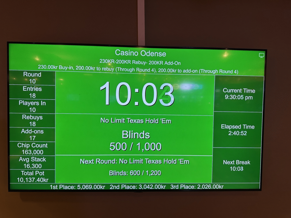 Næste gang der spilles på Casino Odense er i morgen torsdag den 6. november kl. 18.45, hvor der spilles normal torsdagsturnering til 600 kr. Mere info/tilmeld her.