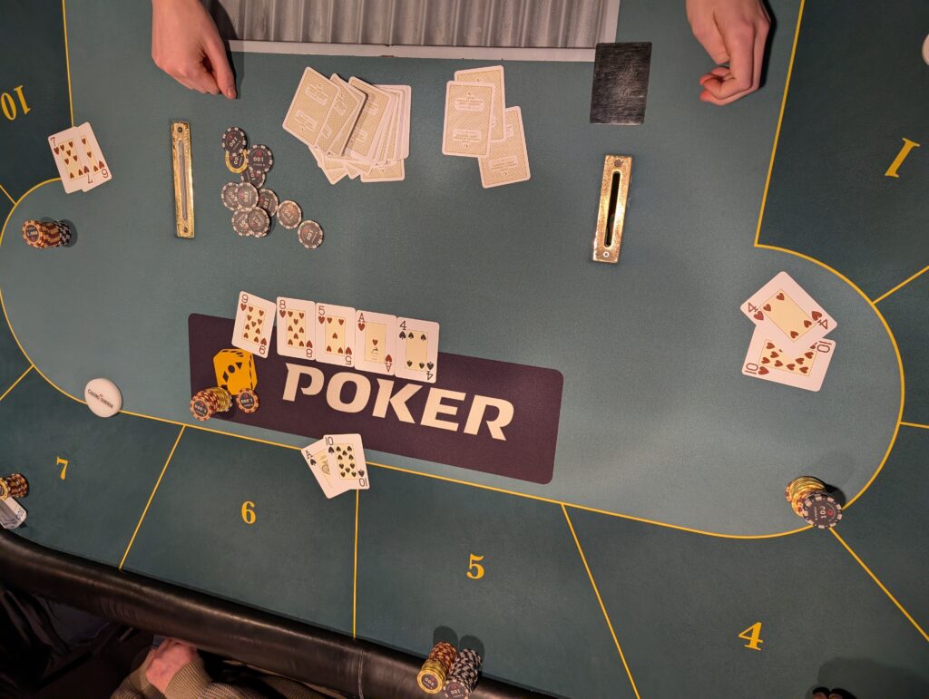 Kreative starthænder kan koste dyrt. Også denne gang måtte Poul Strøyer sande det, da han for anden gang på kort tid blev en del af et bemærkelsesværdigt setup med T4 suited. Louis Larsen sad med en hånd med lidt bedre potentiale – 76 suited – mens Henning “Bageren” Hansen var udstyret med en hånd i den bedre halvdel af starthænder, nemlig AT. De tre kom all-in postflop, hvor Henning havde ramt, mens de andre sad med flushtræk. Heldigt for Louis kom den eneste out, der kunne sikre ham sejren – og så med en af de allerflotteste af dem alle: en straight flush.
