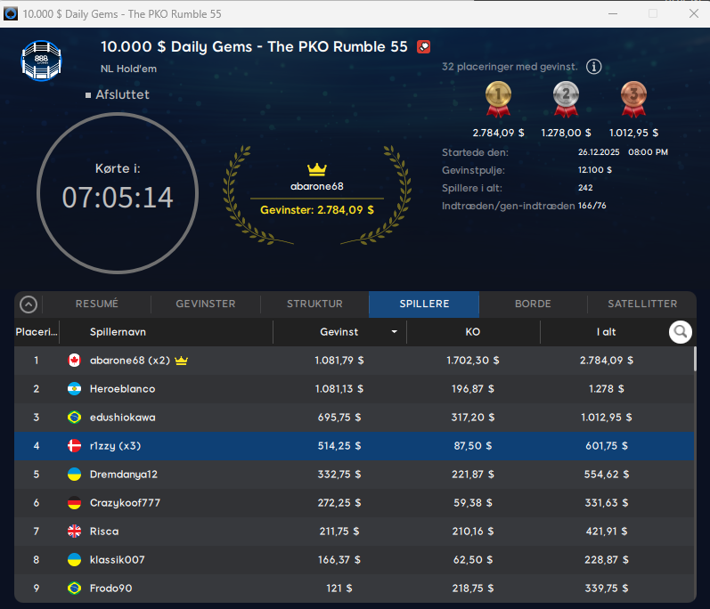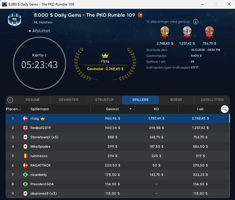 Det drejede sig om $109 Daily Gems The PKO Rumble med $8.000 garanteret. Her blev Anton nr. 1 og vandt totalt $2.748.