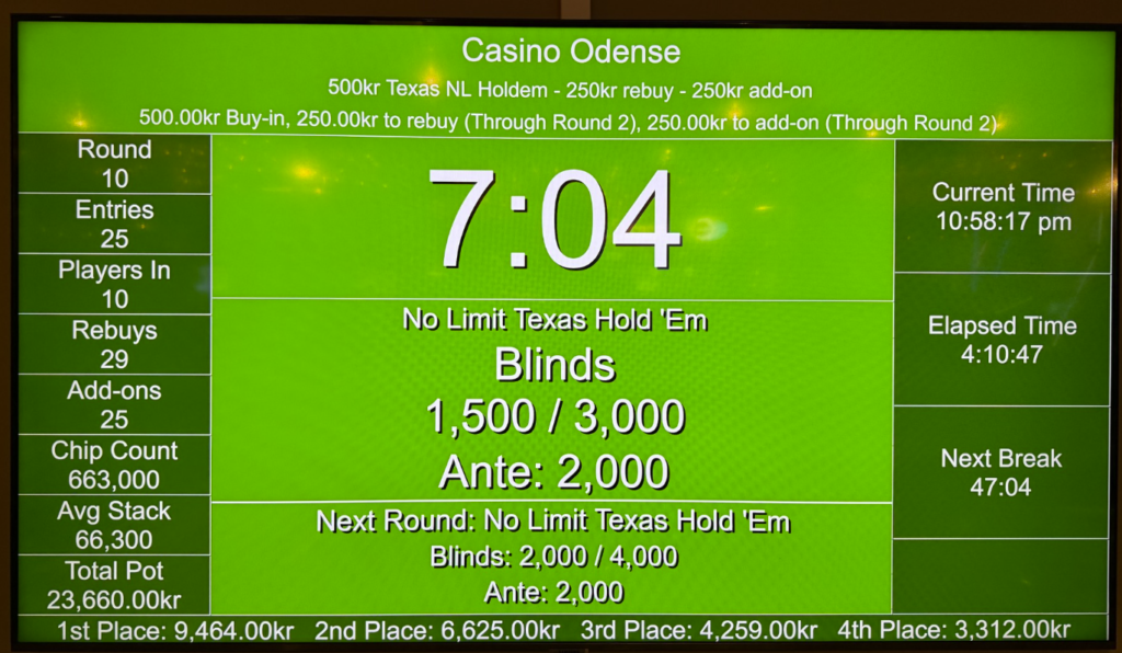 De 25 spillere lavede 29 rebuys inden den “obligatoriske” add-on og så blev præmiepuljen på 23.660 kr.