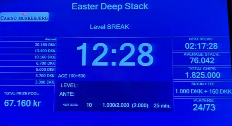 Der var 46 unikke spillere og 27 re-entries i den 1.150 kr. store Easter Deepstack på Casino Munkebjerg mandag eftermiddag. Præmiepuljen endte på 67.160 kr. og penge til top-9.
