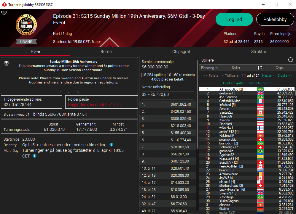 Dansk Poker fulgte med i går aftes i den store jubilæums Sunday Million med seks millioner garanteret i præmiepulje. Der var overlay i turneringen, da “kun” 28.444 entries kom med. Der skulle 30.000 til for at præmiepuljen blev opnået. Der er 32 spillere tilbage, men desværre ingen danskere.
