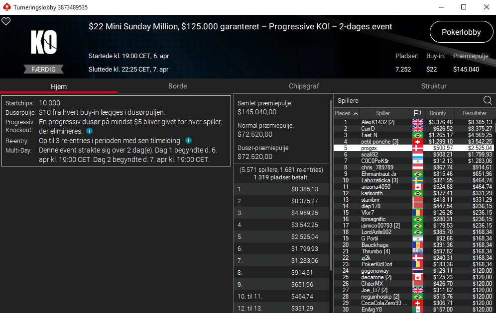 I $22 Mini Sunday Million med $125.000 garanteret havde Danmark sit håb baseret på progzx, der lå godt til inden dag 2. Danskeren sluttede som nr. 5 ud af 7.252 til samlet $3.026 – så tæt på podieplaceringerne.