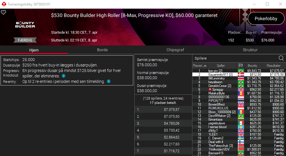 Heldigvis reddede Christian Frimodt (Equanimity911) lidt af danskeræren ved at blive nr. 2 i den store $530 Bounty Builder Highroller PKO med $60.000 garanteret. Andenpladsen gav samlet $7.888. Dansk Poker railede Christian ud på natten, men han fik aldrig fat i det heads-up battle. SCOOP Main Event mesteren lipe piv (Felipe Bojanovsky) fra Brasilien endte som vinderen. Det var ellers et flot besat finalebord med bl.a. MalakaStyle (Juan Pardo), GeraldoCesar og Spraggy, der streamede på Twitch.
