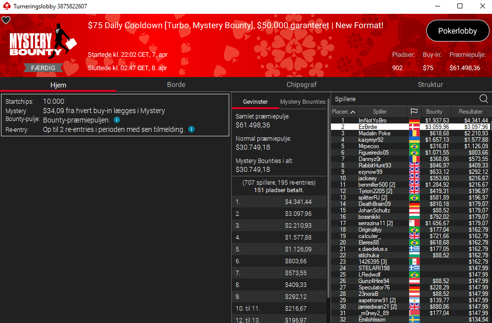 Slutteligt havde EzBirdie et flot resultat. Danskeren blev nr. 2 i $75 Daily Cooldown Turbo Mystery Bounty med $50.000 garanteret. Samlet vandt EzBirdie, der har haft nogle flotte resultater på det seneste, $6.158 for andenpladsen. Ikke dårligt i en $75 turnering. Det hjælper også lidt, når man trækker en del bounties – samlet $3.060 på den konto.
