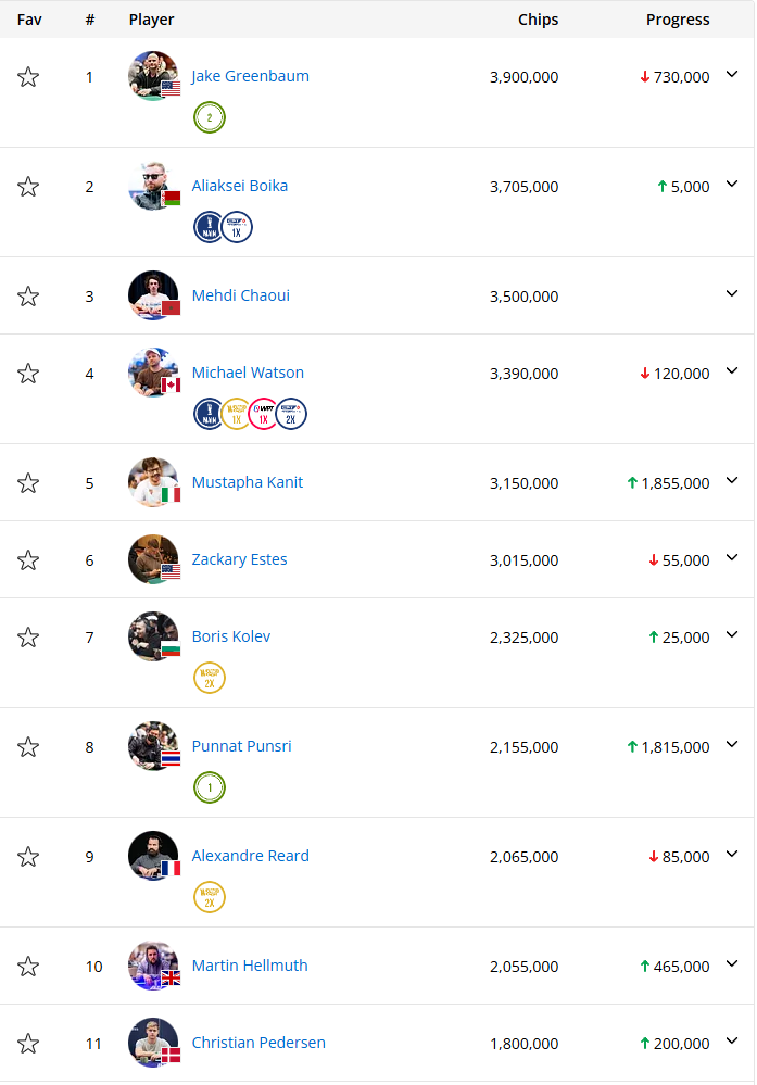 Turneringen føres ved start på dag 3 af amerikanske Jake Greenbaum og kan følges på PokerNews liveblog eller i WSOP+ app’en ift. chipcounts.