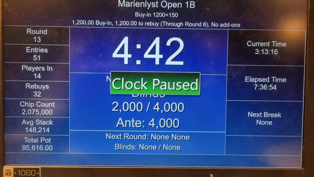 Average stack er 148.214 chips, og præmiepuljen for Dag 1B lød på 95.616 kr., hvilket giver en aktuel præmiesum på 196.992 kr.