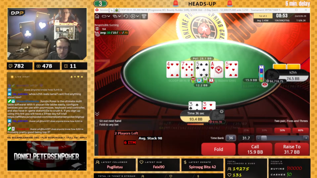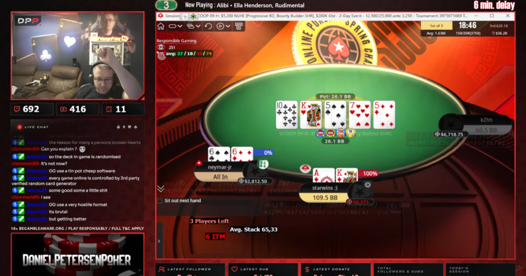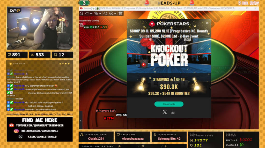 Den hånd skulle vise sig at være den helt store momentum-kicker – herfra kørte Daniel sin modstander over og da sejren og de $90.337 var i hus, så skulle der synges, festes og fejres på streamet: