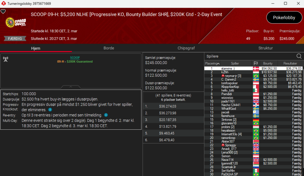 I SCOOP 09: $5.200 NLH PKO Bounty Builder SHR med $200.000 garanteret på PokerStars blev Daniel “starwins” Petersen nr. 1 efter at have domineret finalebordet og til sidst en spændende heads-up. Sejren giver Daniel flotte $90.337 ind på kontoen efter alle bounties er talt op – men vigtigst, så var det første SCOOP-titel til starwins i ti år.