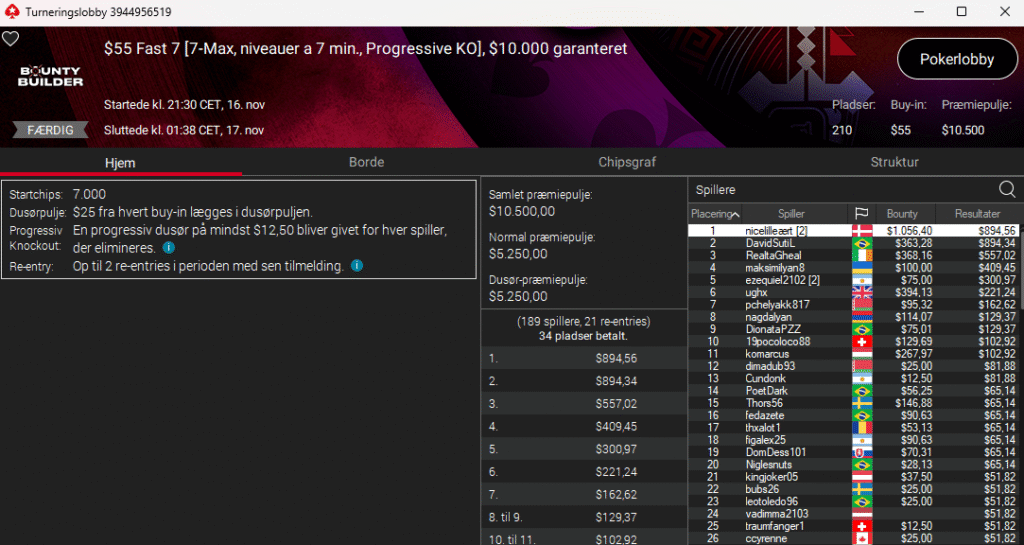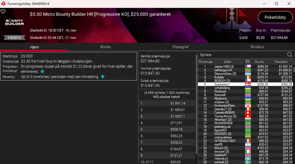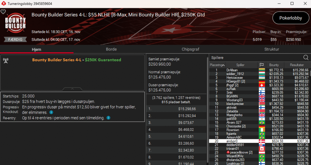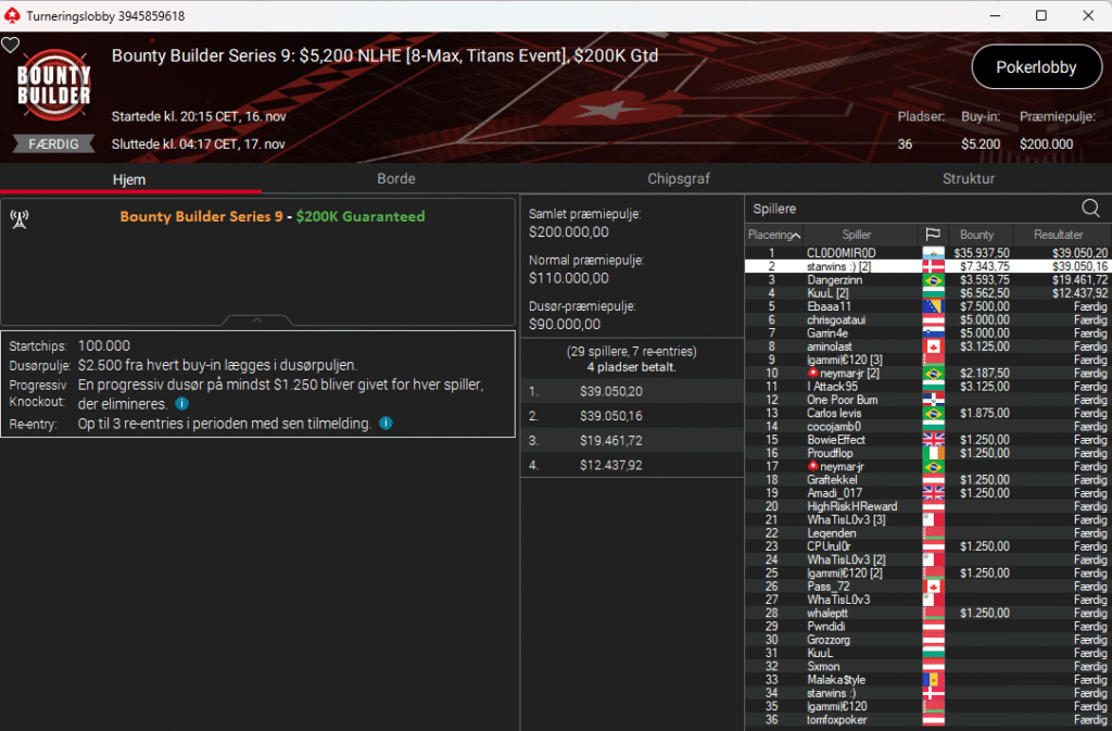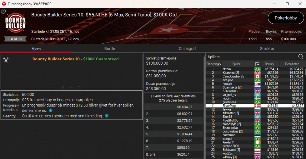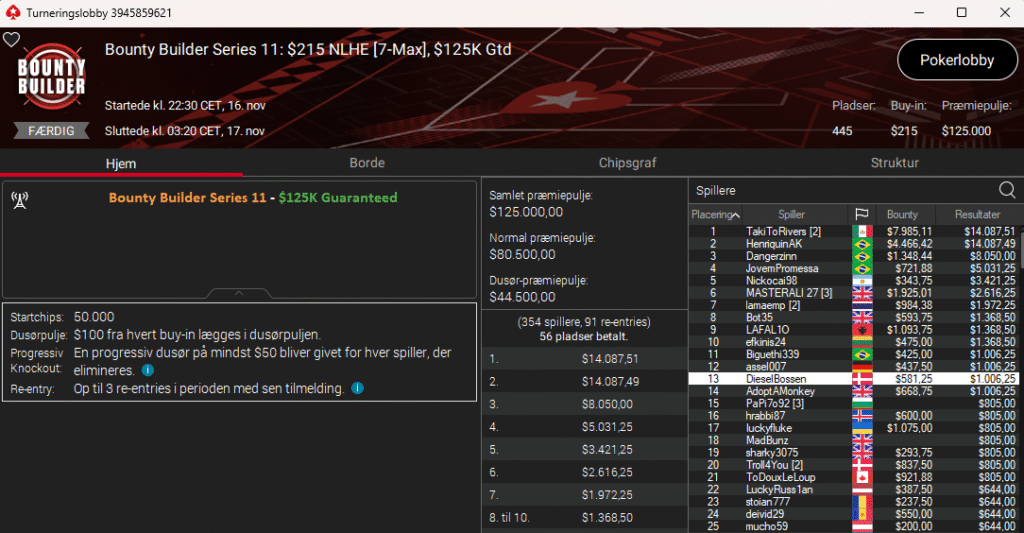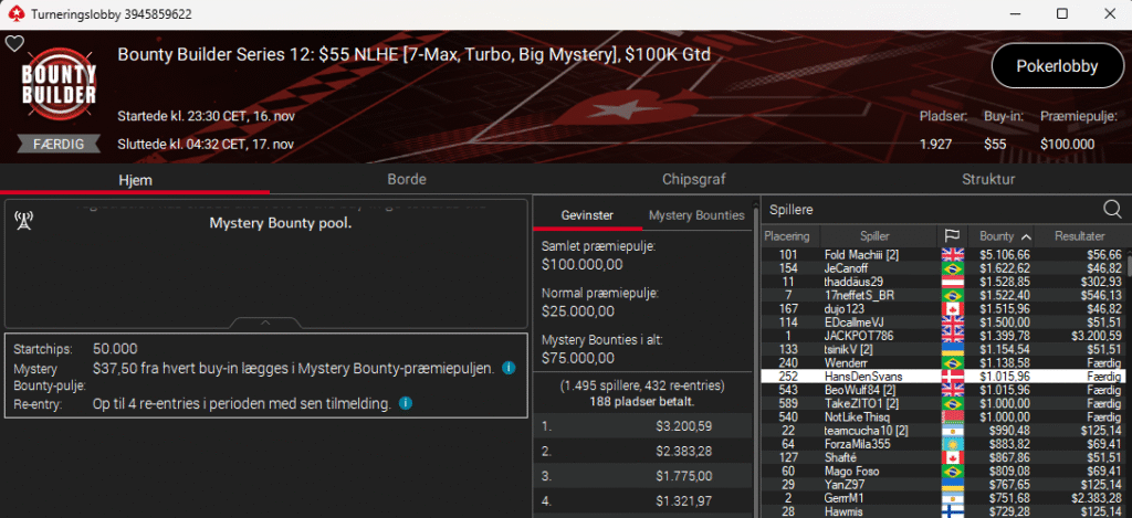 PokerStars kører deres populære Bounty Builder Series lige i øjeblikket. Første dag i den serie var i går søndag den 16. november 2025.