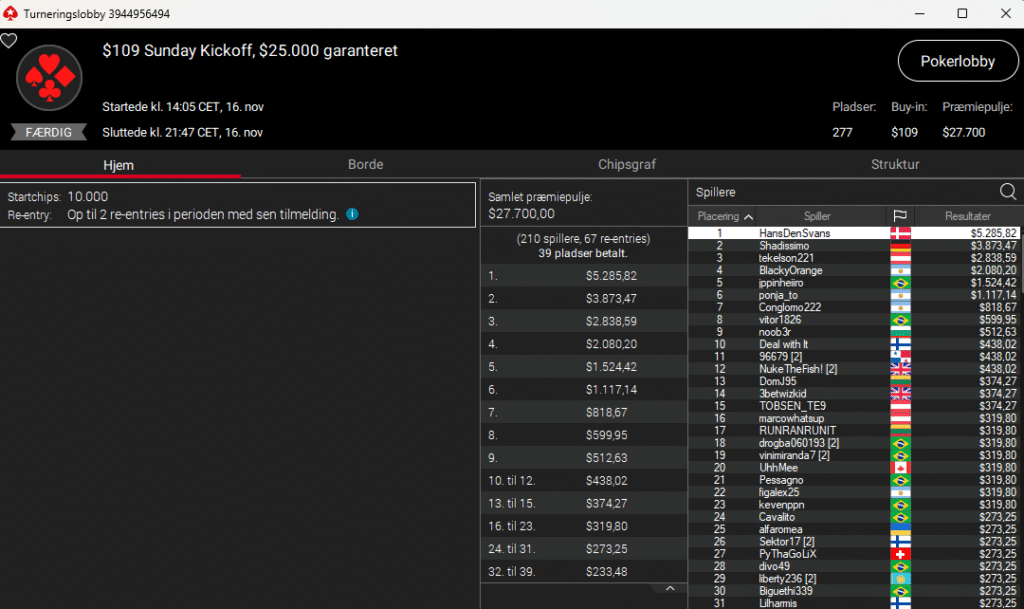 Det blev også til tre flotte sejre til danskerne. Først var det HansDenSvans, der i $109 Sunday Kickoff med $25.000 garanteret blev nr. 1 og vandt $5.286. Stort tillykke.
