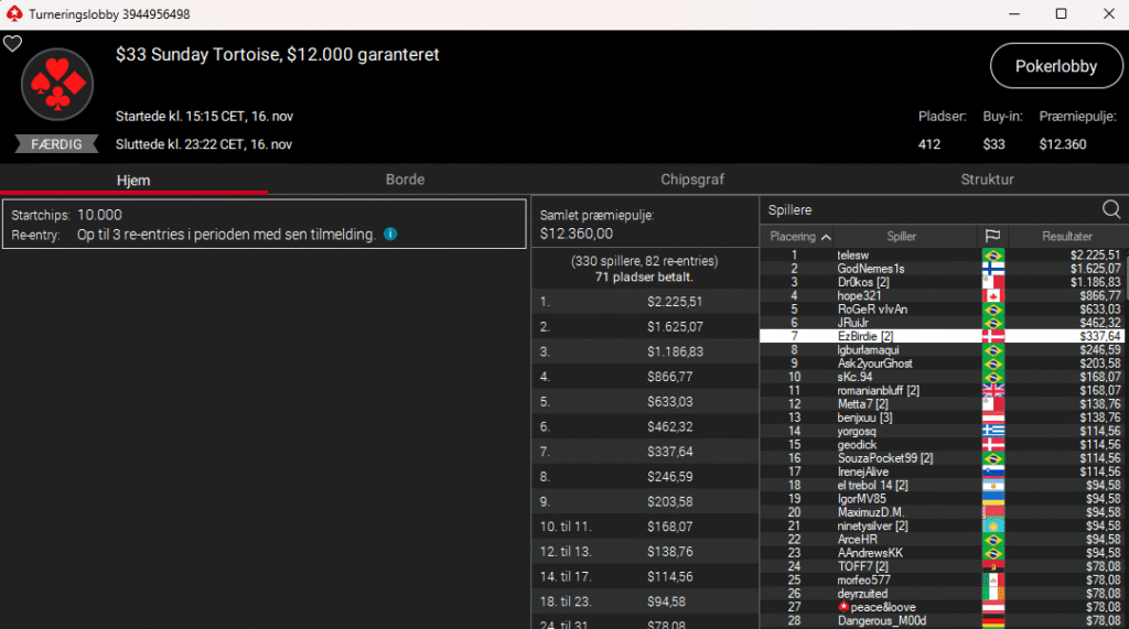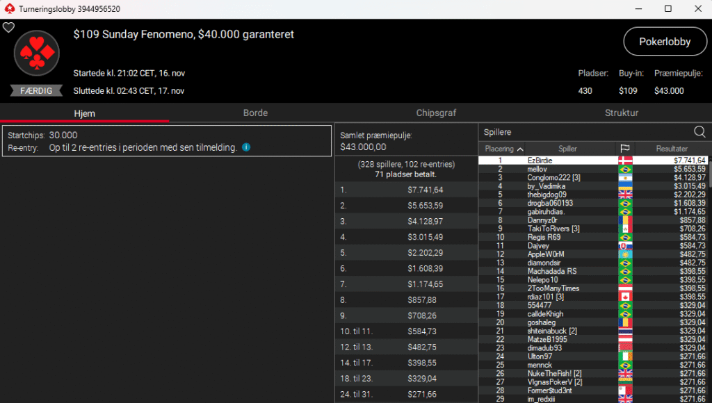Derefter var det EzBirdie, der i den sene tour $109 Sunday Fenomeno med $40.000 garanteret ender øverst og vinder $7.742. Super flot.