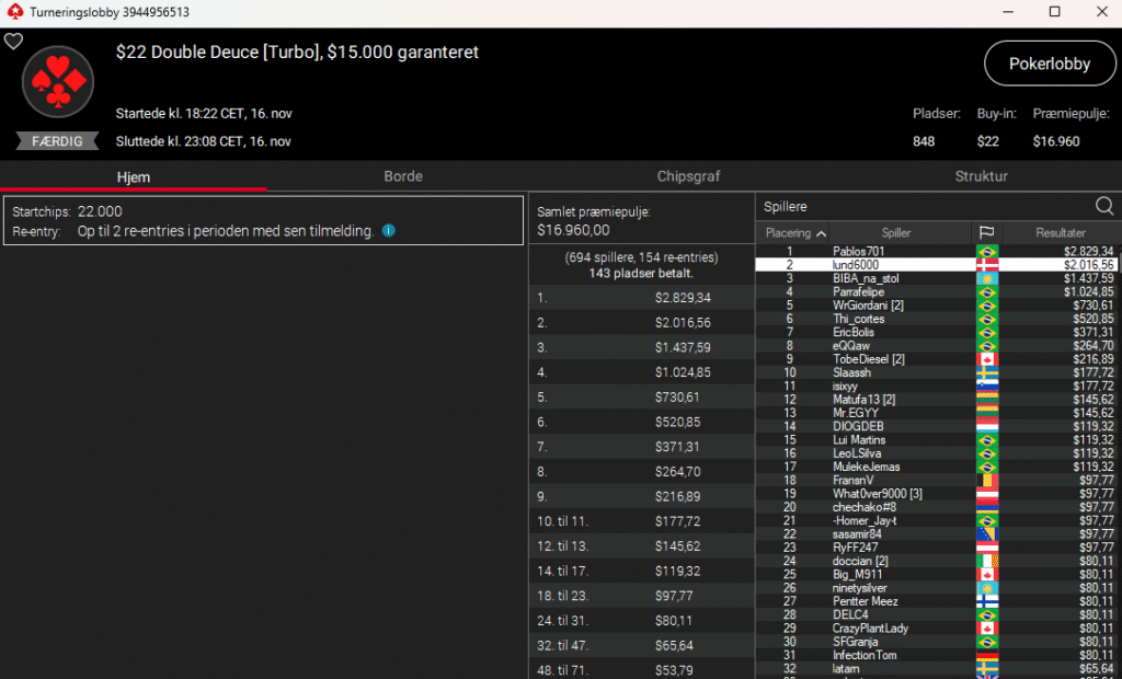 Først var det lund6000 i $22 Double Deuce Turbo med $15.000 garanteret. Præmien endte på $2.017.