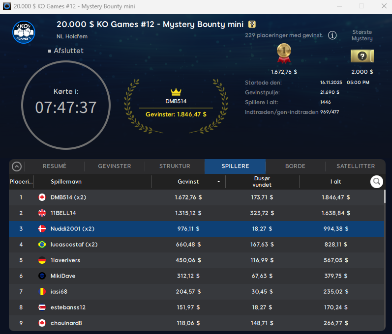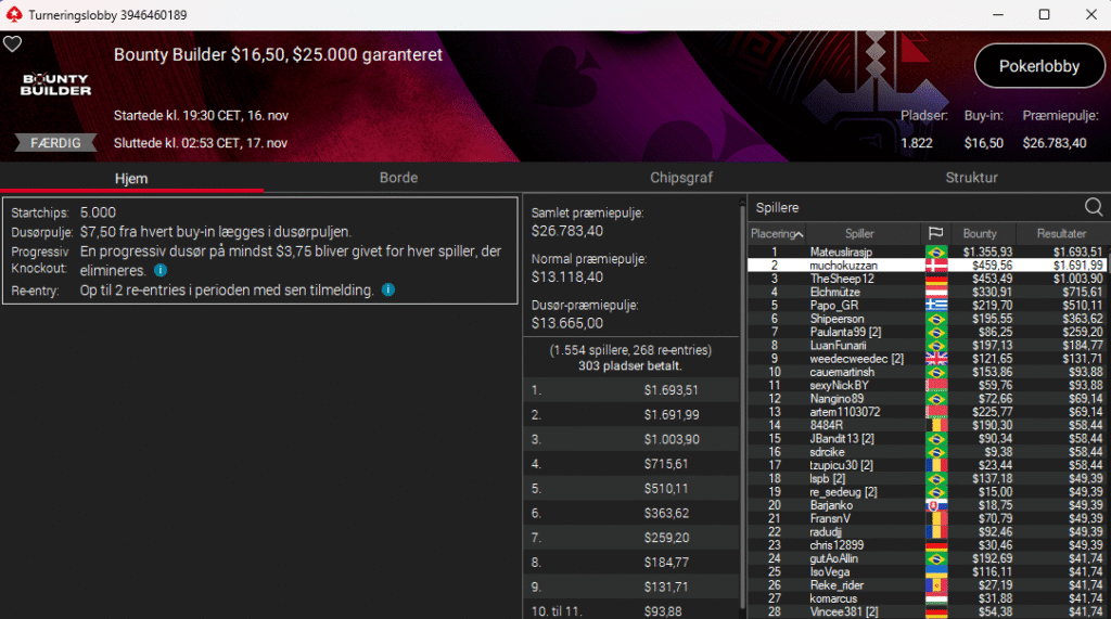 Bagefter var det så muchokuzzan, der i $16,50 Bounty Builder med $25.000 garanteret bliver nr. 2 og vinder samlet $2.152.