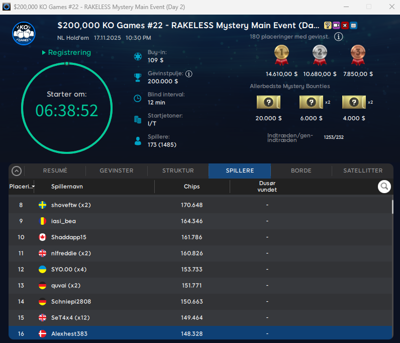Det store søndagsflagskib er derfor lavet om til en masse dag 1 turneringer, som leder ind til den store dag 2 af $109 Mystery Bounty Main Event med $200.000 garanteret. Indtil videre er 173 spillere videre til dag 2. Heraf ni danskere. Der er stadigvæk mulighed for at kvalle til dag 2 i de sidste phase-kvaller.