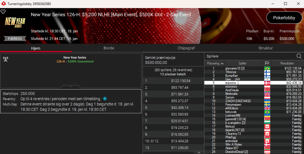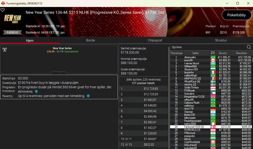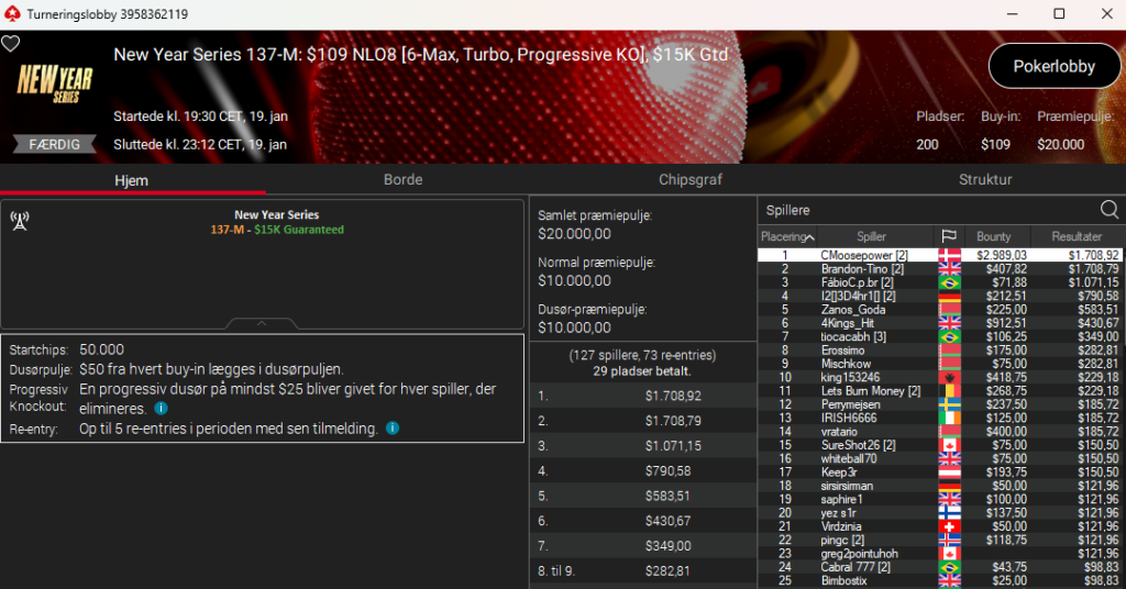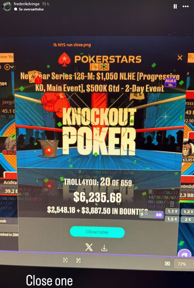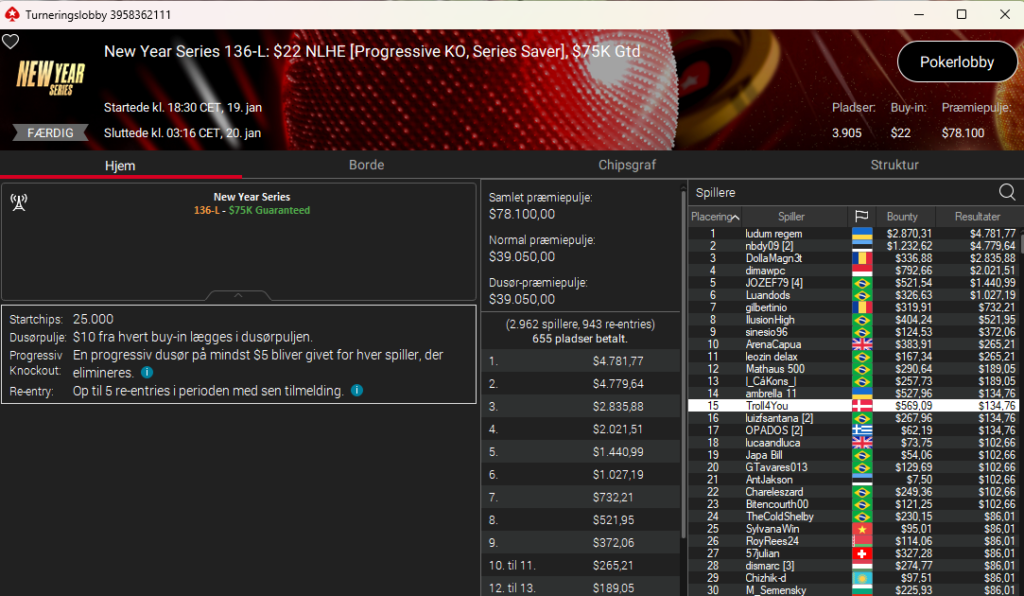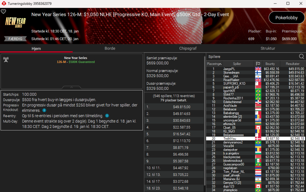 Der var også Frederik “Troll4You” Dvinge i New Year Series: $1.050 NLH PKO Main Event med $500.000 garanteret. Her blev det til en 20. plads til samlet $6.236.