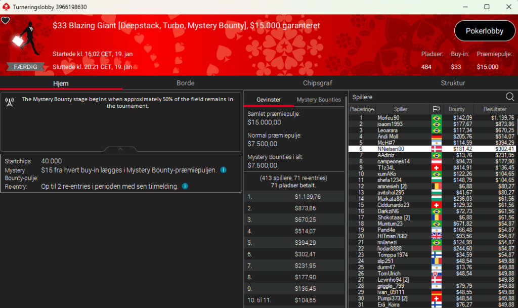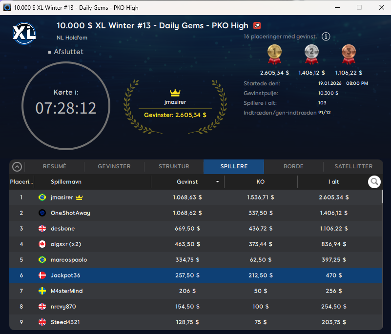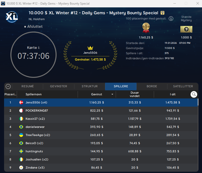 Der var som nævnt ikke nogen danskere videre i søndagsflagskibet for en gangs skyld. Vi hoppede nu alligevel derind for at tjekke lobbys. Der fandt vi Jens5506 som vinderen af $22 XL Winter Daily Gems Mystery Bounty Special med $10.000 garanteret. Sejren gav Jens5506 $1.474.