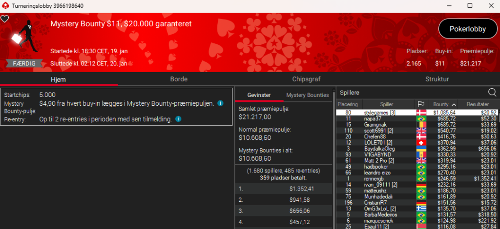 Vi slutter lige mandagens opfølgning af med stylegames, der i $11 Mystery Bounty med $20.000 garanteret blot blev nr. 80 – men men – vi danskere kan altså det der med at trække den største bounty på det seneste – og det gjorde stylegames i den grad med en $1.061 bounty, der var den største i spillet. Samlet vinder danskeren $1.107.