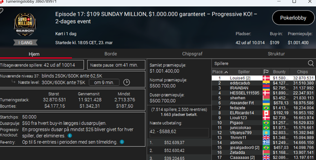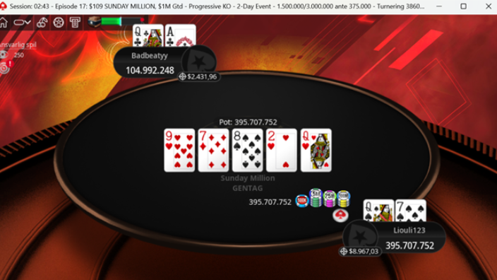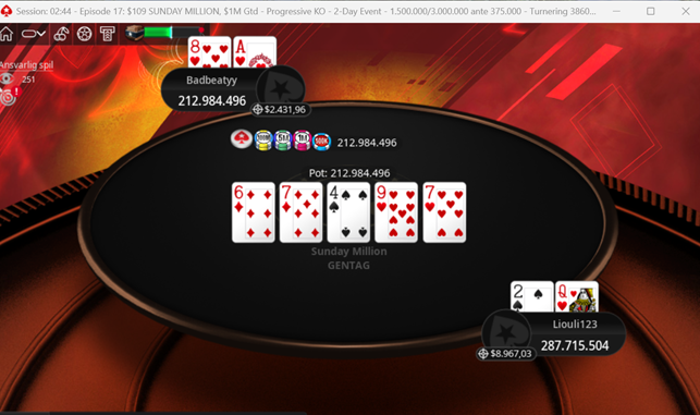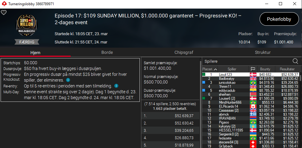 Til sidst var sejren i hus og Liouli123 kan juble over den flotte sejr i Sunday Million og en præmie på $93.319 incl. bounties. Louise6 sluttede som nr. 7 og cashede $10.660. HESSEL111595 kunne ikke holde fast i sin placering og måtte nøjes med $3.515 for sin 15. plads.