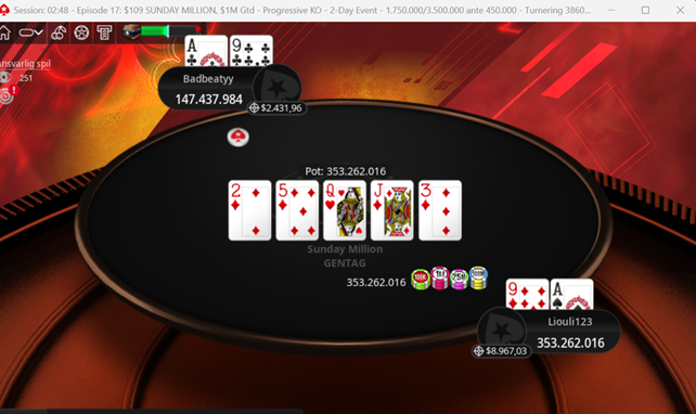 Liouli123 spillede herefter en god gang postflop poker, hvor han kæmpede sig flot tilbage inden han dobler sig i front. Her måtte Liouli123 dog have hjælp af Fru Fortuna, da han var skidt inde. En syver på flop og der var byttet rundt, englænderen skulle ramme sit es, det skete ikke i stedet ramte han håne-kortet i form af en dame.