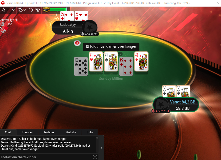 Stort tillykke til danskerne i dag med de flotte præstationer og resultater. Speciel stort tillykke til vores nye danske Sunday Million vinder Liouli123.