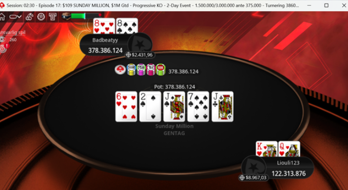 Det var danske HESSEL111595, der lå 2er inden dag 2 af $109 Sunday Million med $1.000.000 garanteret. Det skulle dog vise sig at være en anden dansker, der kom hele vejen og blev endnu en dansk vinder af den legendariske turnering. Liouli123 er nemlig sejrsherren mandag aften efter et eufori af all-ins og action, som sjældent set.