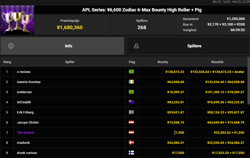 Den danske onlinegrinder fra 10’erne, Mads “Madsmk” Knudsen, er tilbage online og fik en fin 8. plads i APL Series: ¥6.600 Zodiac 6-Max Bounty Highroller med ¥1.250.000 garanteret. Samlet blev det til ¥56.620 – hvilket svarer til ca. 51.895 kr.