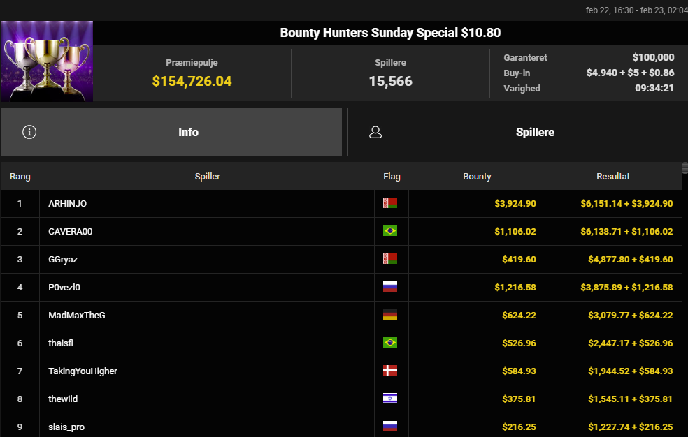Der var en 7. plads og samlet $2.530 til danske TakingYouHigher i $10,80 Bounty Hunters Sunday Special med $100.000 garanteret.