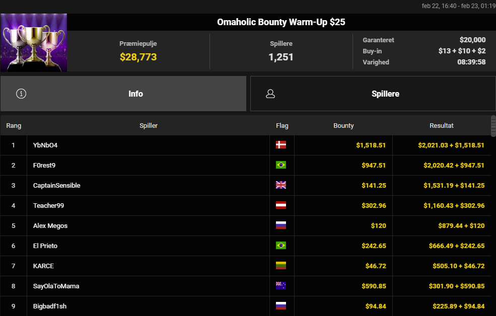 Vi elsker danske sejre og dem var der altså flere af denne søndag. YbNb04 bliver nr. 1 og tager sejren blandt 1.251 entries i $25 Omaholic Bounty Warm-Up med $20.000 garanteret. Samlet endte præmien på $3.540. Tillykke.