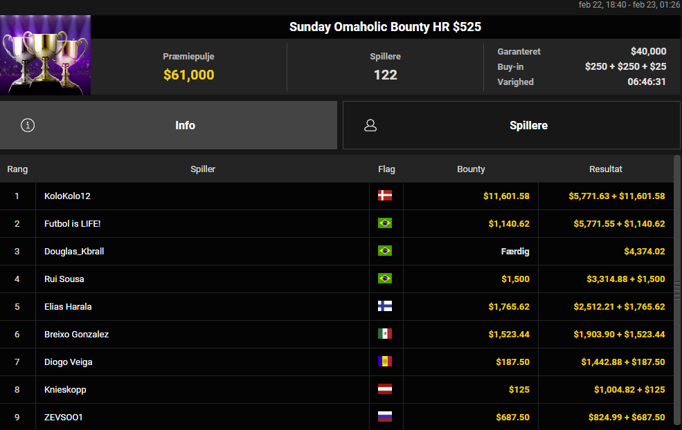 Nok dagens flotteste sejr var i $525 Sunday Omaholic Bounty HR med $40.000 garanteret for KoloKolo12.