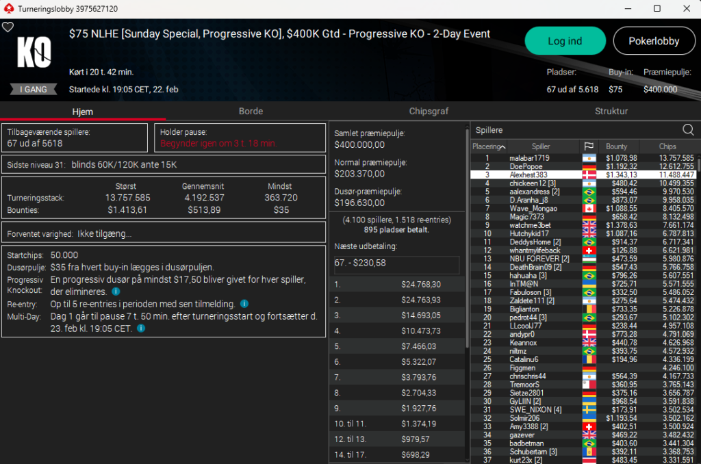På PokerStars er de imellem større serier. SCOOP Warm-Up er slut og det rigtige SCOOP starter den 1. marts. Derfor var der ingen Sunday Million denne søndag. Erstatningen er $75 NLH Sunday Special PKO med $400.000 garanteret. Her var der totalt 5.618 og et overlay. Der er 67 spillere tilbage og to danskere med fine skud. Det er Alexhest383, som ligger nr. 3 samlet og MPT 2026 vinderen, Andreas “andypr0” Brendholdt, der ligger nr. 22. Turneringen starter igen kl. 19.05 i aften.