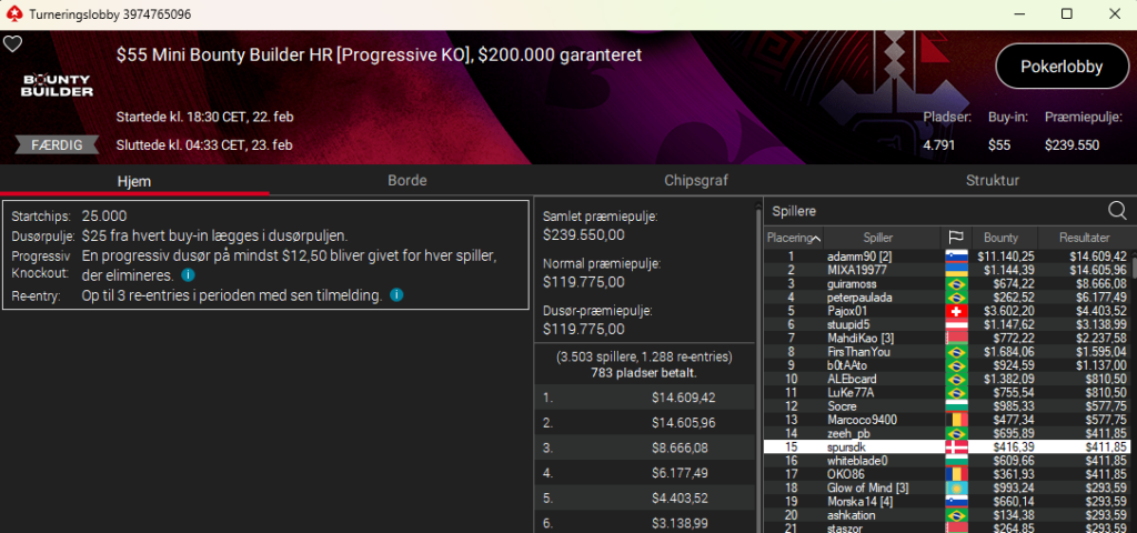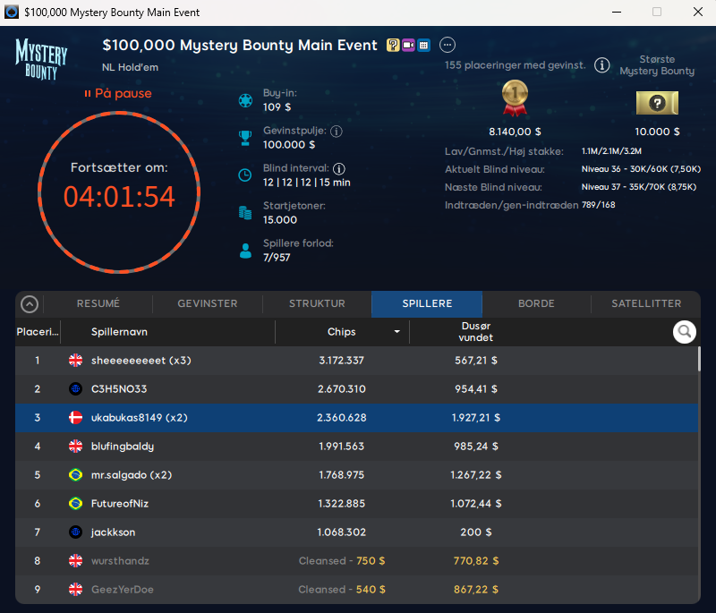 Denne gang var der én dansker videre. Det er ukabaukas8149, der allerede har vundet $1.927 i bounties og potentielt kan vinde flere. Danskeren ligger nr. 3 ud af 7 og er et godt bud på en samlet vinder.