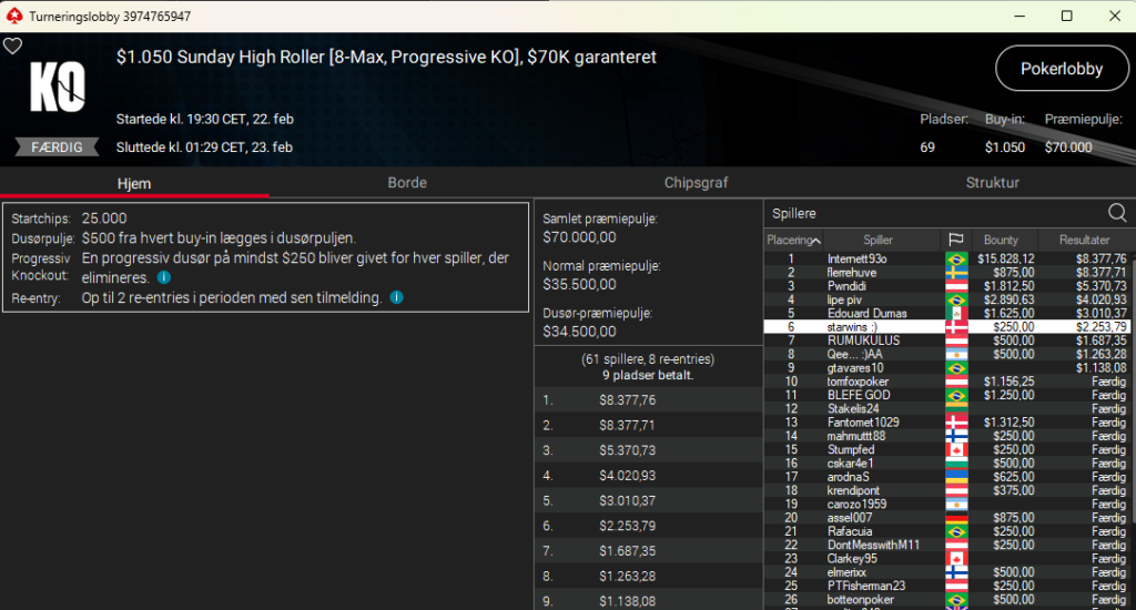 Daniel “starwins” Petersen havde et finalebord på sit stream i nat. Det var i $1.050 Sunday Highroller 8-Max PKO med $70.000 garanteret. Her blev det lige ved og næsten med en 6. plads og samlet $2.504.
