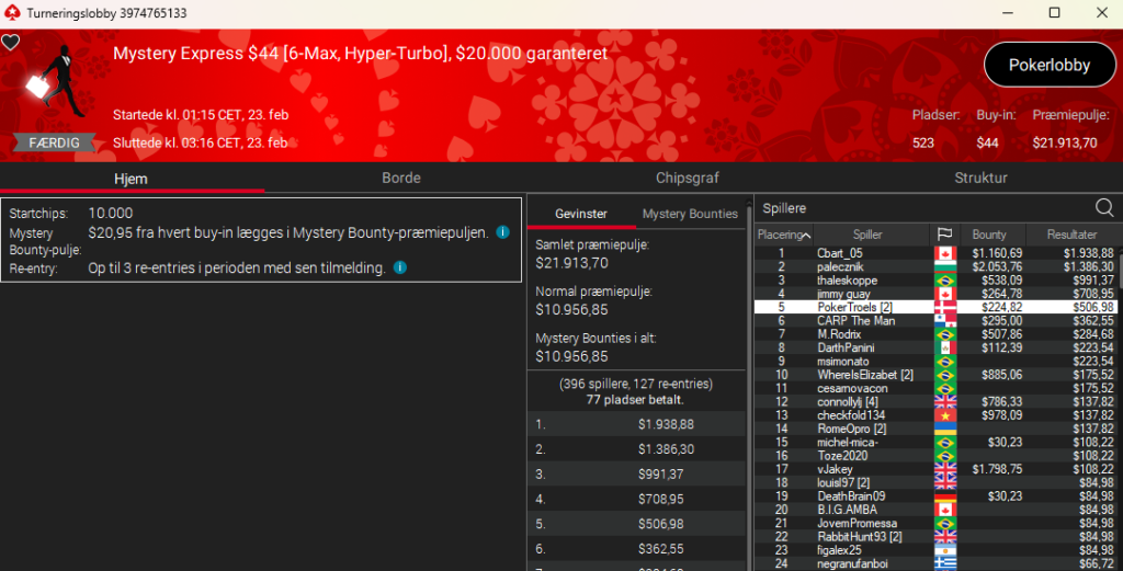 Slutteligt fandt vi en 5. plads til PokerTroels i $44 Mystery Express 6-Max Hyper Turbo med $20.000 garanteret. Samlet var præmien på $732.