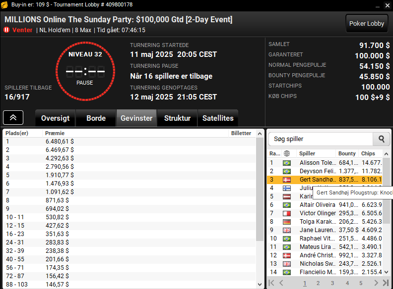 I The Sunday Party: $109 PKO med $100.000 garanteret var der et lille overlay. Der er 16 spillere tilbage og blandt dem to danskere. Gert Sandhøj Plougstrup er bedste dansker som nr. 3 mens André Christiansen ligger nr. 12.