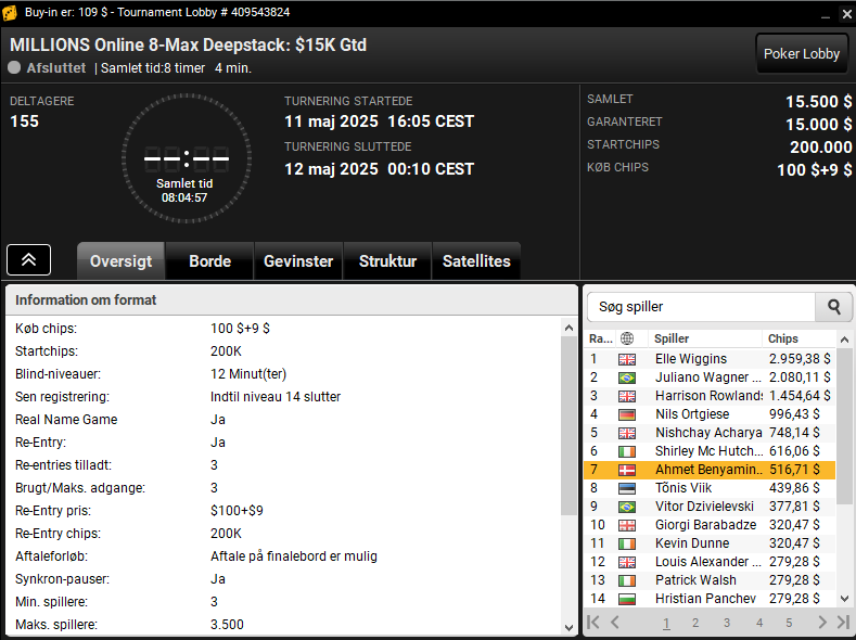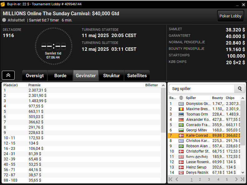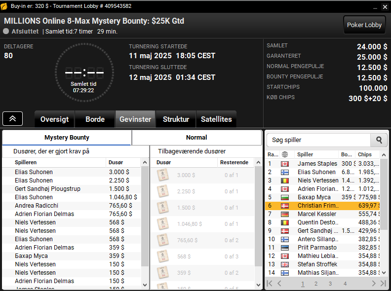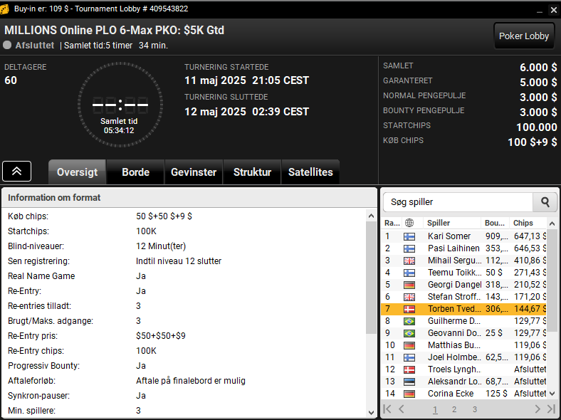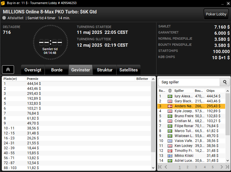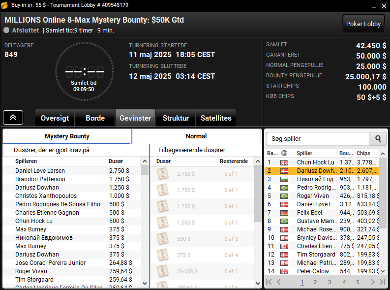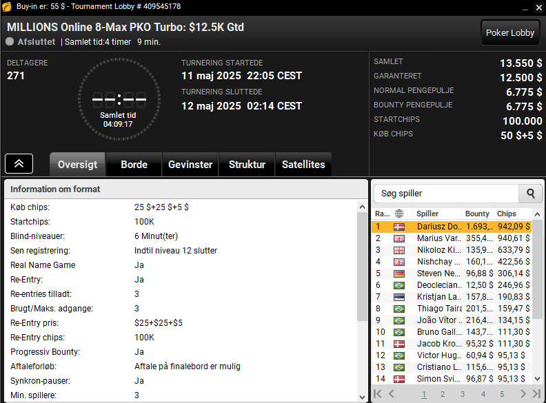 Dariusz var også på spil i den sene $55 MILLIONS Online 8-Max PKO Turbo med $12.500 garanteret. Her vandt danskeren samlet $2.635.