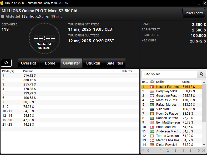 I $22 MILLIONS Online PLO 7-Max med $2.500 garanteret var det Kasper Funderskov Kejlberg, der stod som vinder med en præmie på $516.