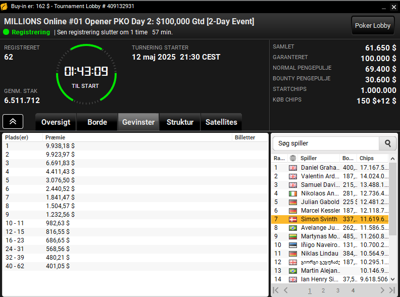 I MILLIONS Online #01: $162 Opener PKO med $100.000 garanteret spilles der flere flights ind i dag 2. Nogle af disse flights kører i dag. Indtil videre så er 62 spillere videre med Simon Svinth som bedste dansker på en samlet 7. plads. Lige pt. er der i alt fem danskere videre men vi kan se flere andre danskere i aktion blandt chipleaderne i de sidste dag 1 flights.