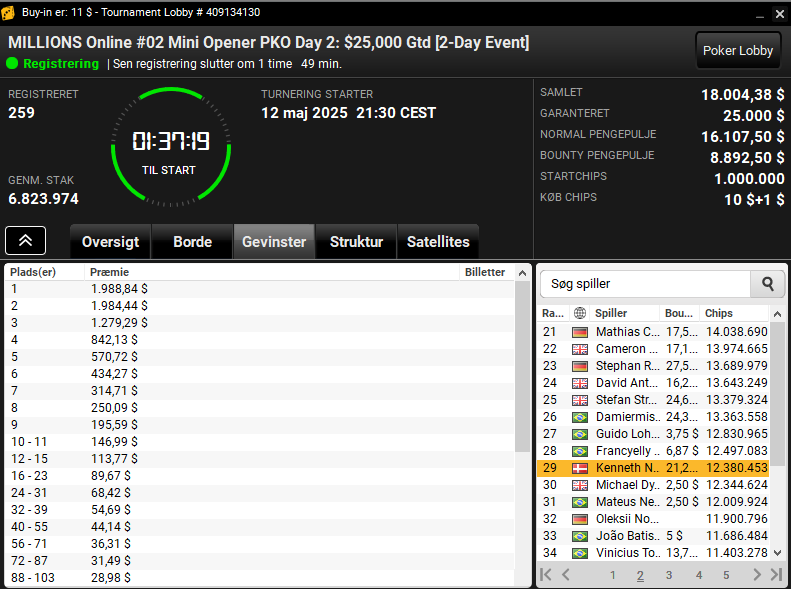 I samme turnering i “mini-udgaven”, som er en $11 Mini Opener PKO med $25.000 garanteret ligger Kenneth Nielsen som bedste dansker indtil videre. Der er 259 i skrivende stund videre til dag dag der starter kl. 21.30. Der er hele 15 danskere videre. Flot antal.