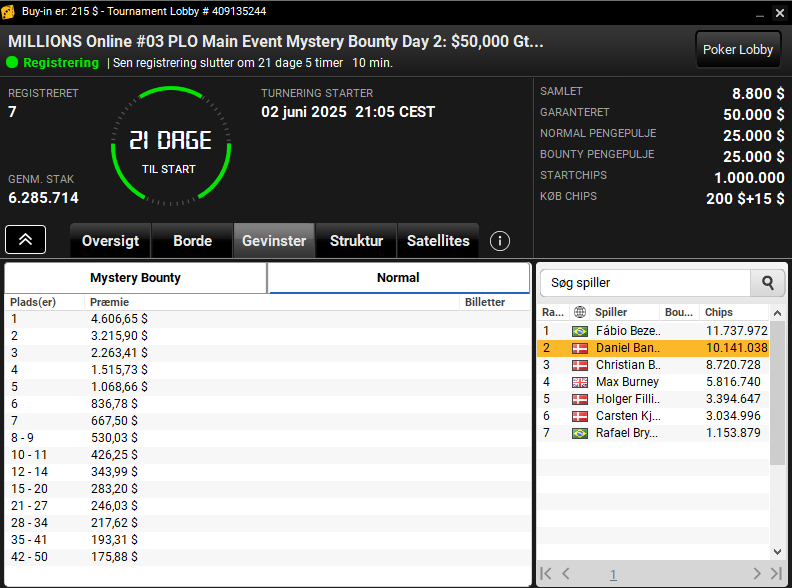 I MILLIONS Online #03 PLO Main Event Mystery Bount med $215 i buyin og $50.000 garanteret har vi indtil videre fire danskere videre. Daniel Bang-Ortmann ligger bedst til som nr. 2 i chips samlet. Der er kun syv spillere videre indtil videre og dag 2 starter først om 21 dage. Så masser af muligheder til at kvalle til denne spændende finale: