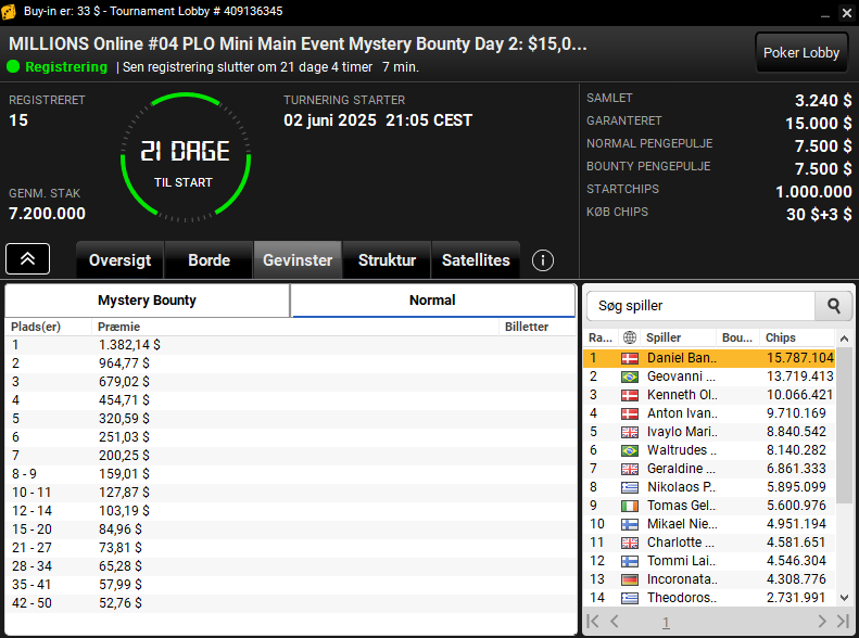 Den samme turnering findes som $33 med $15.000 garanteret. Her er Daniel Bang-Ortmann også på spil med chipleadet. Kenneth Olsen ligger godt til. Der er dog tre uger til finalen der også.
