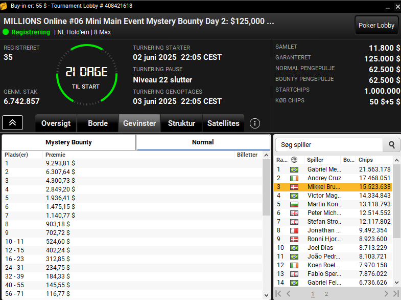Vi har en $55 MILLIONS Online #06 Mini Main Event Mystery Bounty med $125.000 garanteret, hvor Mikkel Bruun er bedste dansker på en samlet 3. plads. Denne turnering har også først sin finale om tre uger. Så masser af muligheder for at kvalle dertil.