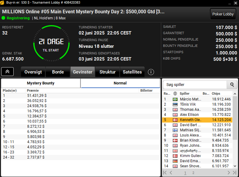 I den helt store $530 MILLIONS Online #05 Main Event Mystery Bounty med $500.000 garanteret har vi indtil videre 32 spillere videre til finaledagen, der spilles om tre uger. Fem danskere er med blandt de 32. Kenneth Olesen ligger bedst til af disse indtil videre på en 5. plads.